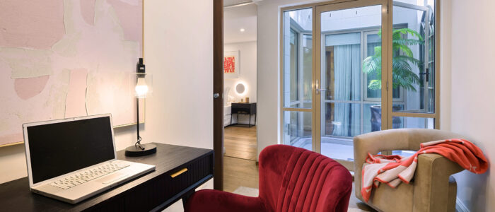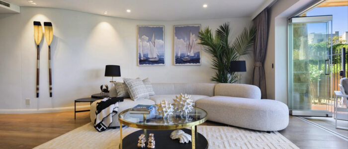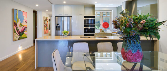 Grand open-plan interiors unfold to an all-seasons courtyard, framing the iconic Opera House panorama. The impeccable layout of the apartment creates a seamless connection between indoor comfort and outdoor entertaining. The gourmet kitchen is a statement of modern refinement, appointed with 40mm stone benchtops, a breakfast bar, and premium Miele appliances including a built-in coffee maker.